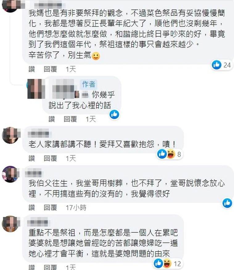 消息曝光後,有網友同情原PO遭遇表示:「人都有極限。」、「誰負責準備誰作主吧!婆婆又不幫忙~」、「我也不反對拜拜,但要求一定要拜多少盤也太累。」、「拜拜有心最重要吧!誠心勝過儀式感。」