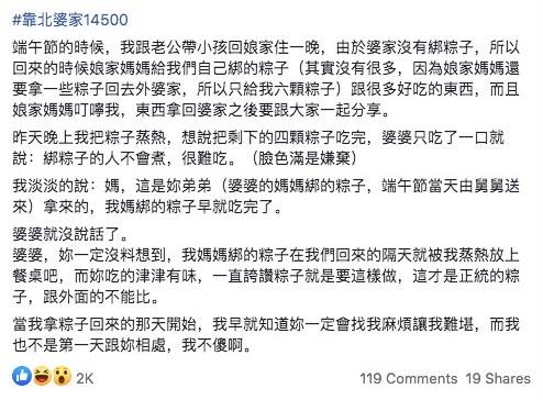 不過她也不傻,當下只是淡淡開口對婆婆說,「媽,這是妳弟弟拿來的(也就是婆婆的媽媽綁的粽子),我媽綁的早就吃完了」讓對方當場說不出話來。原來,從娘家帶回來粽子的隔天,她馬上就蒸熱放到餐桌上,全部都吃完了,「當時婆婆還吃得津津有味,一直誇讚粽子就是要這樣做,這才是正統的粽子,跟外面的不能比,我早就知道她會找我麻煩,又不是第一天跟她相處了!」